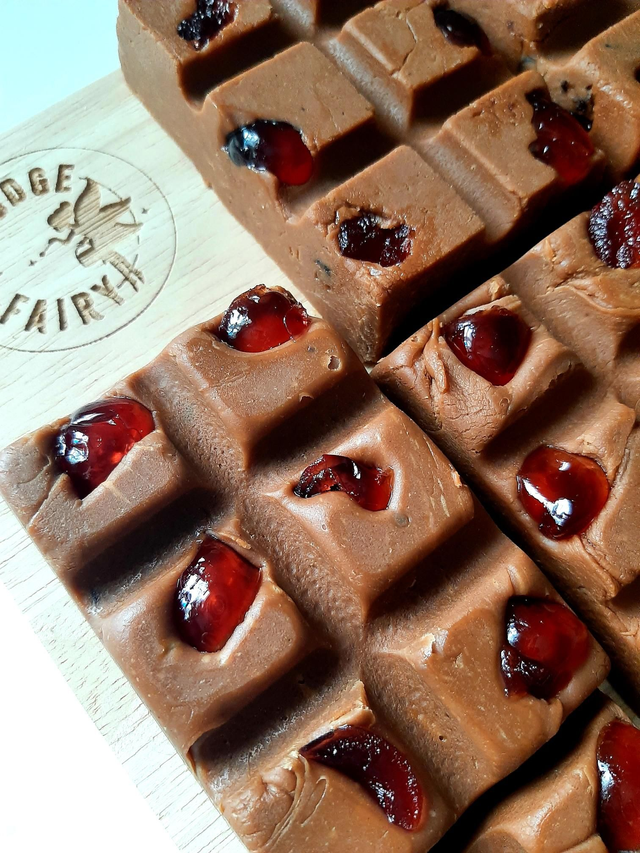 Soft, creamy Black Forest Gateau fudge with glace cherries throughout. Bliss!