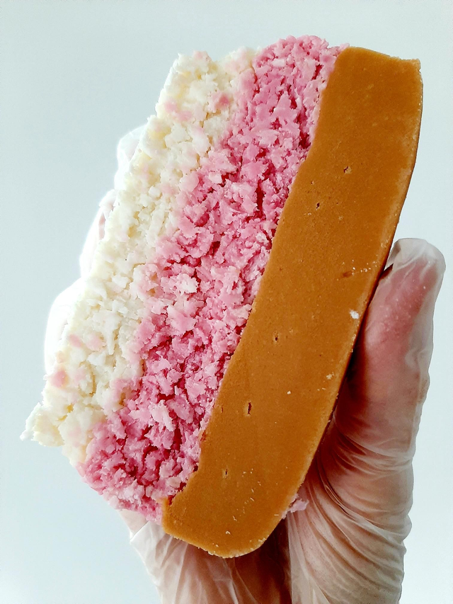 Coconut ice layered in white and pink, topped with a creamy vanilla fudge.